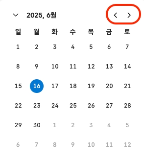 )으로 표시됩니다. 그리고 원하는 일자로 클릭하면 현재 오른쪽 일정표에 표시되는 일정 캘린더에는 해당 일자에는 파란색 선으로 표시됩니다.