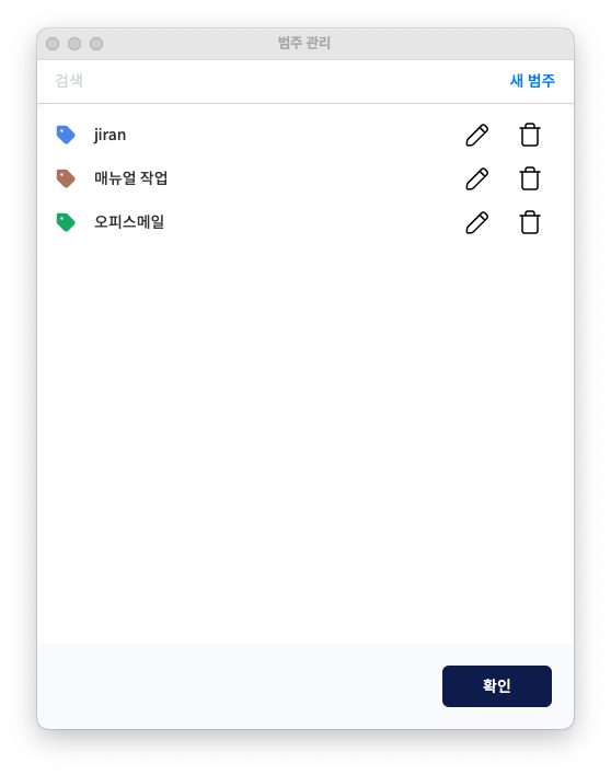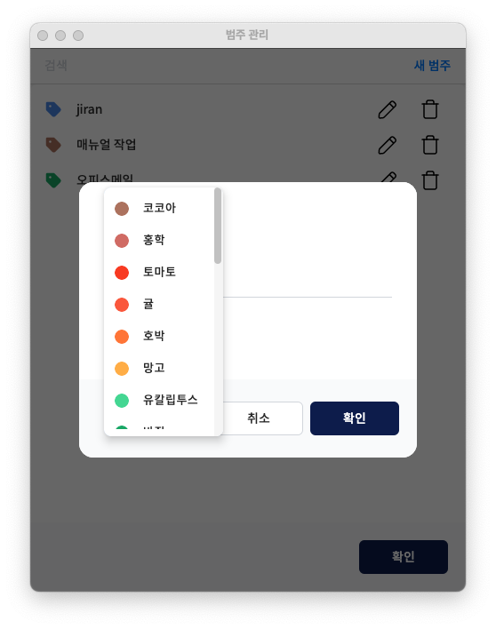 '범주 관리' 버튼을 누르면, 범주 목록에서 개별 범주의 이름과 색상을 변경하거나 삭제할 수 있습니다. 필요한 수정을 완료했다면, '확인'을 눌러 저장하고 나옵니다.
