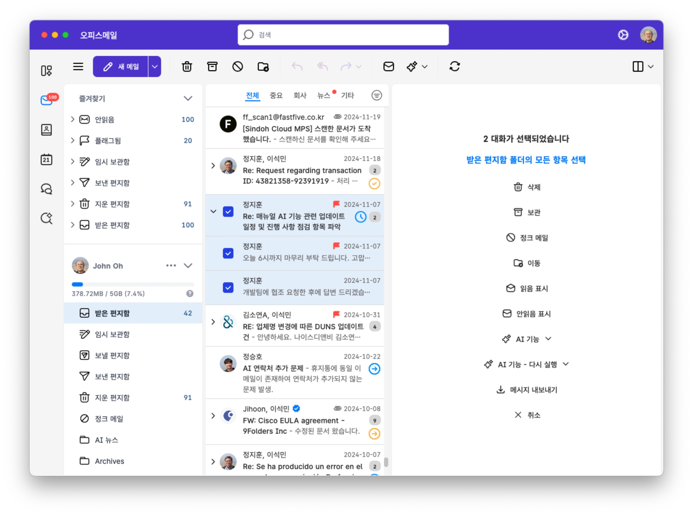 스레드에서도 개별 메일에서 마우스 오른쪽 버튼을 눌러 사용할 수 있는 컨텍스트 기능을 모두 사용할 수 있으며, 스레드에서 다중 선택 메일의 경우, 오른쪽 화면에 표시되는 기능을 선택해서 사용할 수 있습니다. 예를 들어, 스레드에서도 삭제, 보관, 정크 메일 신고, 이동, 읽음 표시, 안읽음 표시, 플래그 등의 모든 기능을 사용할 수 있습니다.