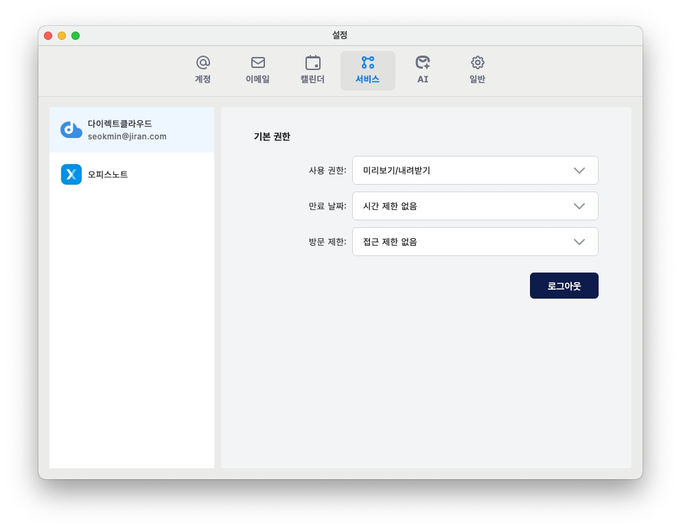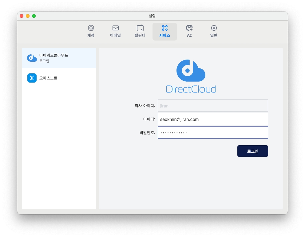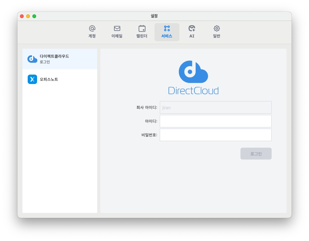 오피스메일 데스크탑에 회사 계정을 추가하였으면, 다이렉트클라우드 (DirectCloud) 설정을 위해서 앱 화면 우측 상단의 설정 (
