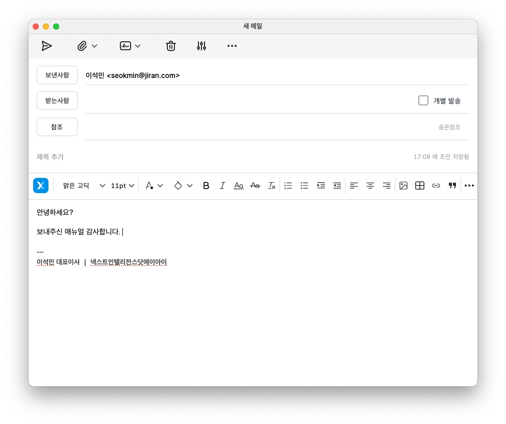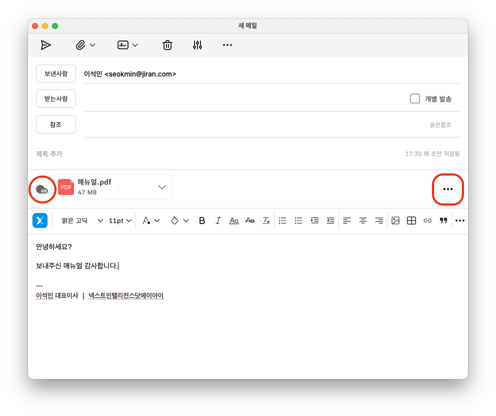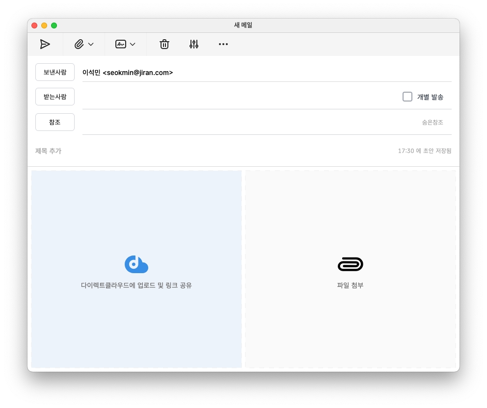 새 메일 작성 창의 툴바 위에 첨부 파일의 링크가 추가된 것을 볼 수 있습니다. 링크로 전송될 때는 왼쪽에 링크 (