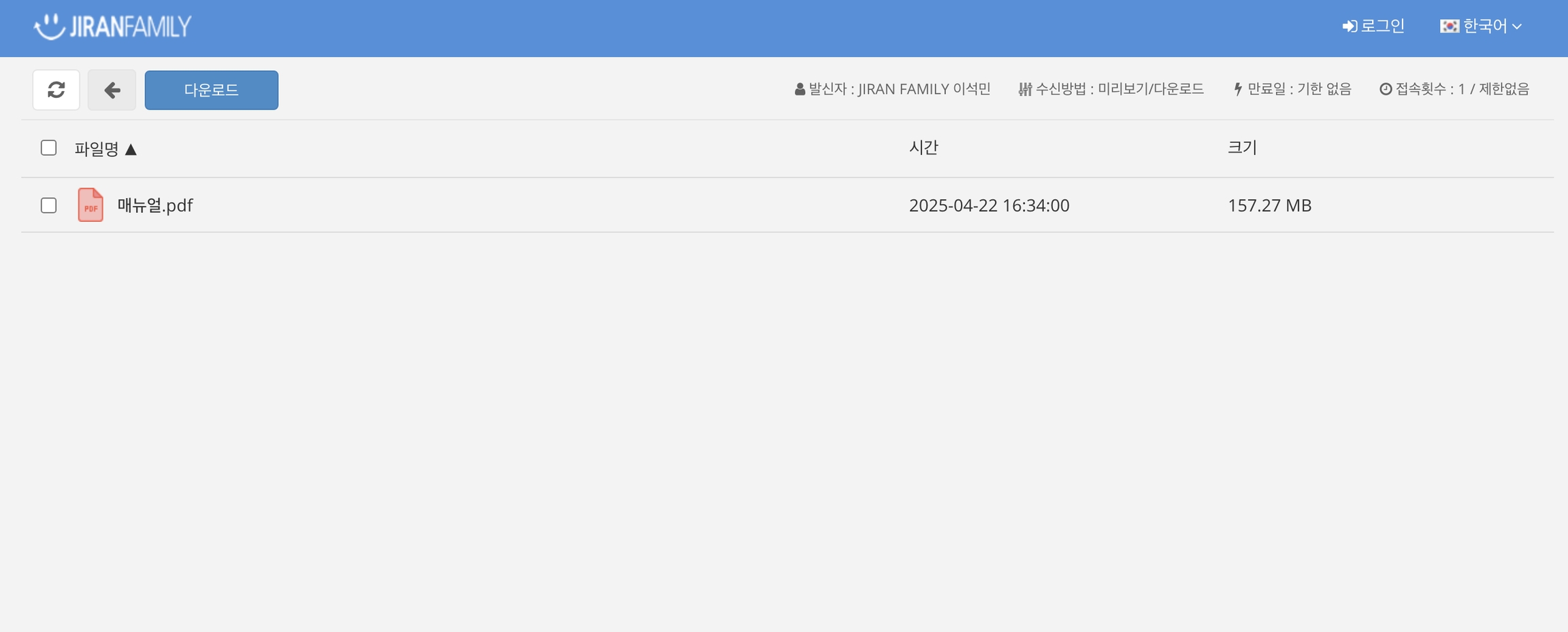 이제 메일을 보내면, 수신인은 해당 메일에 첨부된 대용량 파일의 링크를 볼 수 있습니다. 수신인은 메일에 첨부된 파일명을 누르면 다이렉트클라우드의 해당 파일이 브라우저로 열리고 파일을 다운로드할 수 있습니다.