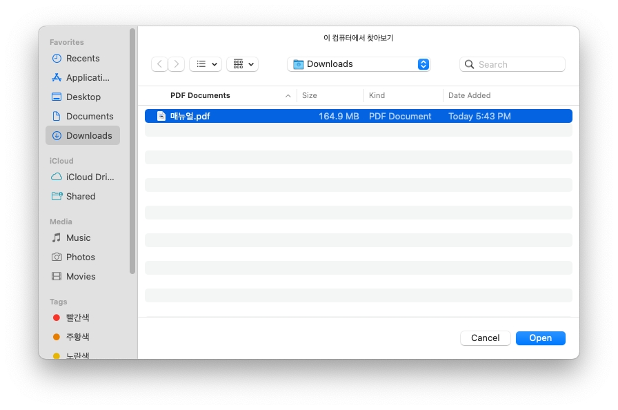 파일 탐색기 또는 파인더에서 컴퓨터에 저장된 대용량 파일을 선택하고 "Open" 또는 "열기"를 선택합니다.