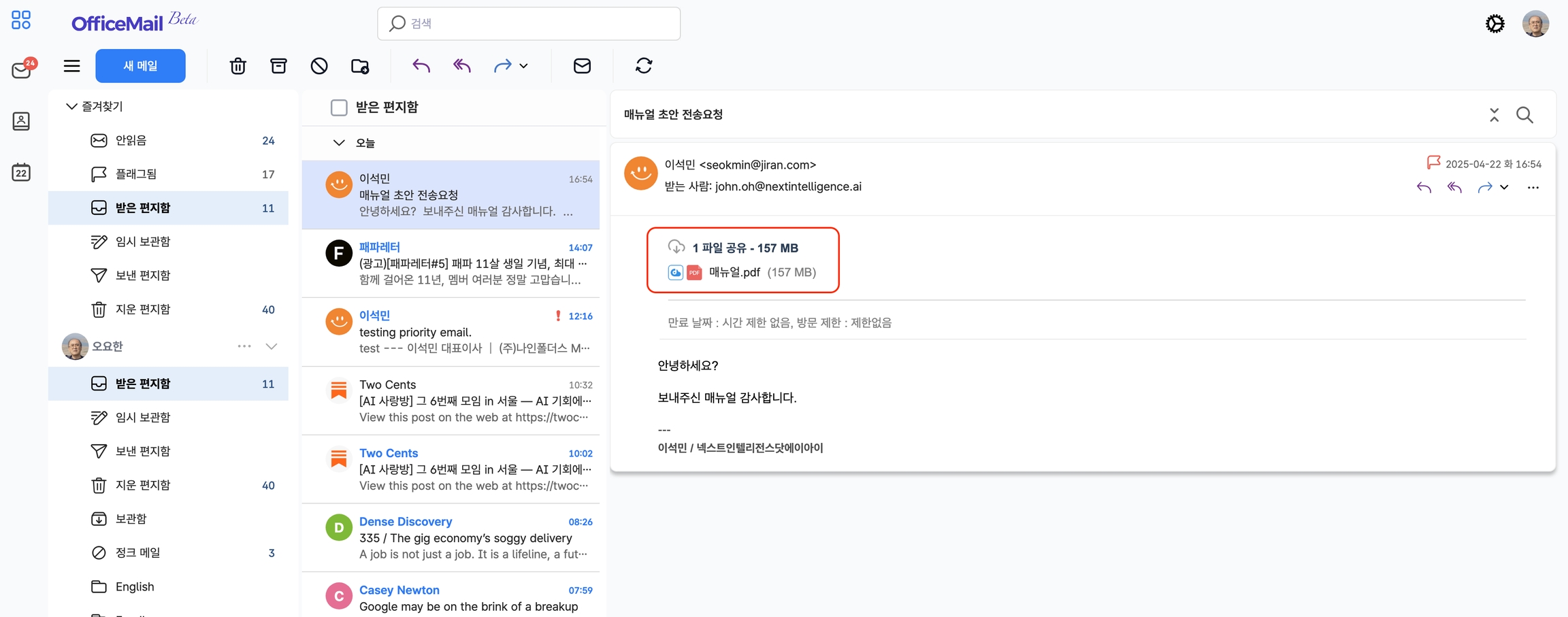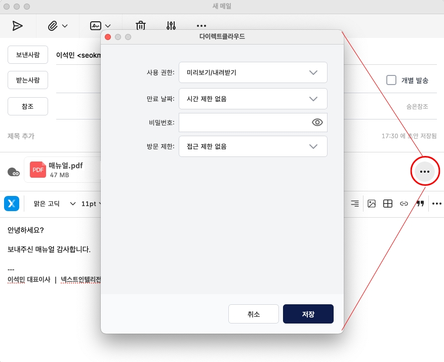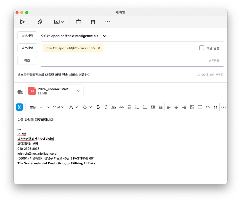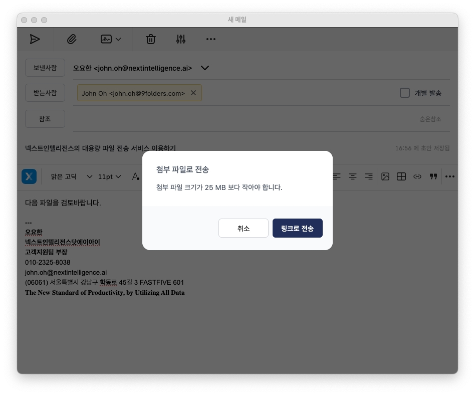 첨부 파일이 25MB가 넘는 파일이므로, 클라우드에 전송하고 해당 파일의 클라우드 링크를 첨부하게 됩니다.