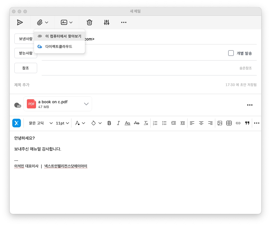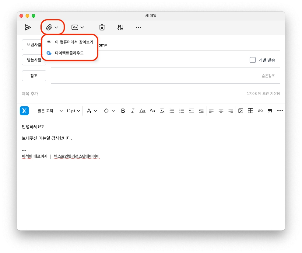 이제 첨부 파일을 추가하기 위해, 상단 툴바에서 첨부 파일 아이콘을 누르면 2가지 메뉴가 나타납니다. 로컬 PC/Mac에서 파일을 찾아서 첨부하는 방법과 '다이렉트클라우드'에서 파일을 찾아 공유하는 방법을 선택할 수 있습니다.