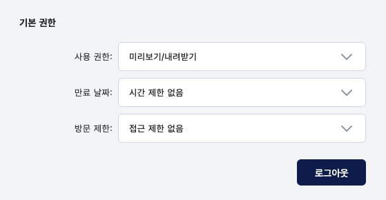 사용 권한: 클라우드에 올려두고 공유할 파일에 대한 기본 사용 권한을 설정할 수 있습니다. 다음 3가지 중에 한개를 선택할 수 있으며, 기본값은 미리보기/내려받기입니다. (미리보기, 다운로드, 미리보기/내려받기)